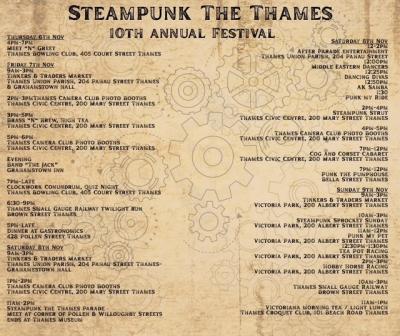 On Sunday, this marvellous weekend continues with “Steampunk Sprocket Sunday” at Victoria Park in Thames. This is an enjoyable, free family event that includes “Teapot Racing”, “Punk My Pet”, “Hobby Horse racing”, and the wonderful free entertainment of “Flames Of Plenty” and “Give it a Go Circus”. There is also a Steampunk Market, along with numerous food vendors. Come on down and enjoy the festivities under the beautiful trees at Victoria Park.